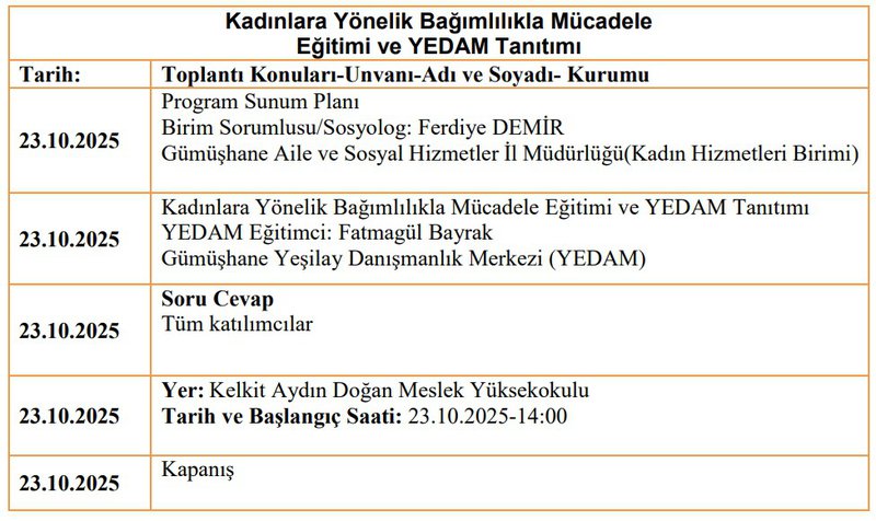 8 Mart 2024 Dünya Kadınlar Gününde kamuoyuna duyurulmuş ve uygulamaya konulan Kadının Güçlenmesi Strateji Belgesi ve Eylem Planı'nın paydaşlarından birisi olan YEŞİLAY, Bu çerçevede bağımlılık yaşayan bireyler ile yakınlarına ücretsiz ve gizlilik esaslı psikososyal destek hizmeti sunan Yeşilay Danışmanlık Merkezi (YEDAM) ve Kelkit Aydın Doğan Meslek Yüksekokulumuz ile iş birliğiyle 23.10.2025 tarih ve saat:14:00'da Konferans Salonunda "Kadınlara Yönelik Bağımlılıkla Mücadele Eğitimi ve YEDAM Tanıtımı" başlıklı eğitimin düzenlenecektir.