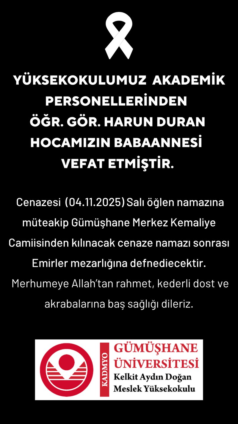 Yüksekokulumuz Akademik Personellerinden Öğr.Gör. Harun DURAN Hocamızın Babaannesi Vefat Etmiştir.